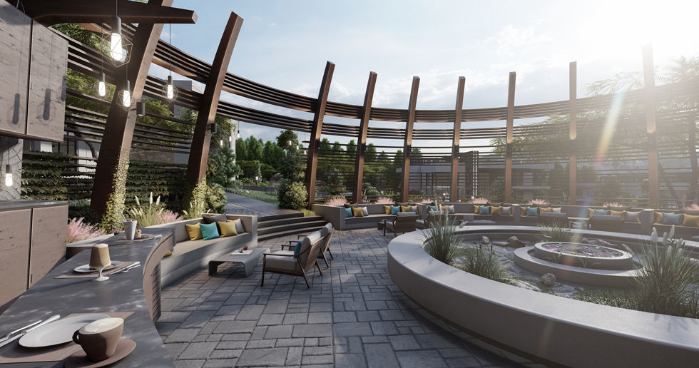 A cozy outdoor sitting area with a campfire in the middle of it, and a bar on one side.